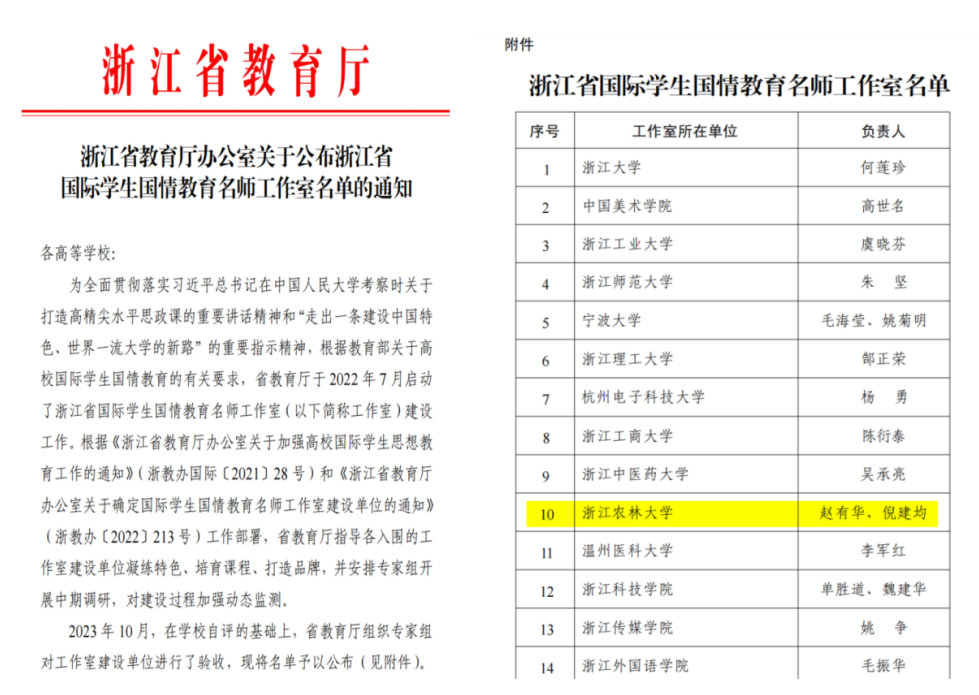 11月3日,浙江省教育廳發(fā)布《浙江省教育廳辦公室關(guān)于公布浙江省國際學(xué)生國情教育名師工作室的通知》。我校趙有華、倪建均領(lǐng)銜的浙江農(nóng)林大學(xué)國際學(xué)生國情教育名師工作室正式獲批。