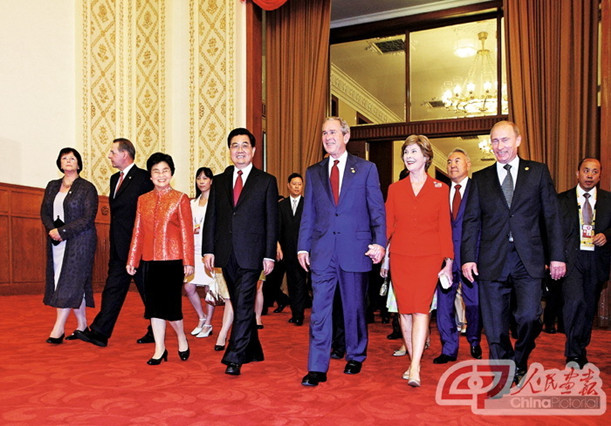 2008年8月8日,中國國家主席胡錦濤在北京人民大會堂舉行隆重宴會,歡迎來華出席北京奧運會開幕式的各國各地區貴賓。這是胡錦濤主席和夫人劉永清同貴賓們共同步入宴會大廳。中國共產黨的歷代領導集體始終高度重視與世界的交往。進入新時期,中國與世界的關系發生了歷史性變化。中國高舉“和平、發展、合作”的旗幟,全方位外交空前活躍。元首外交、峰會外交、多邊外交、公共外交等大國外交亮點頻現,為推動建設和諧世界作出了重要貢獻。