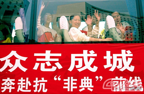 2003年春,北京,醫護人員奔赴抗擊“非典”的前線。在抗擊非典的關鍵時刻,中共中央總書記、國家主席胡錦濤向全黨和全國人民發出號召:“我們要大力弘揚萬眾一心、眾志成城,團結互助、和衷共濟,迎難而上、敢于勝利的精神。”這二十四字精神,是對人民群眾抗擊非典偉大精神的精辟概括,是對民族精神的新的豐富,是鼓舞全黨和全國人民奪取抗擊非典斗爭勝利的強大動力。一場沒有硝煙的特殊戰斗,進入攻堅階段;一座抗擊非典的偉大長城,巍然矗立起來。