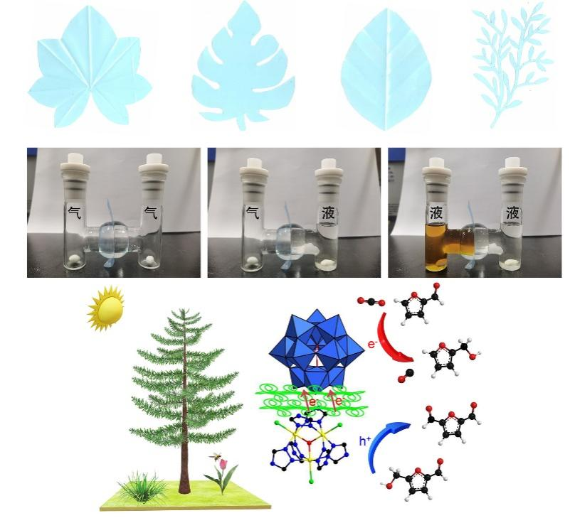 人造樹葉能源轉化技術的發展符合國家提倡的“既要綠水青山,也要金山銀山”未來發展大計。當前人造樹葉僅能在光敏劑和犧牲劑共同參與下發生氧化或還原半反應,反應速率緩慢且反應體系復雜,阻礙了人造樹葉的應用。為此,團隊設計了一種雙功能人造樹葉并構建了光轉化全反應體系,通過充分發揮纖維素定向電子傳遞作用與多金屬氧酸鹽電子儲存的功能,在光照的條件下,實現了電荷快速分離、電荷儲存與生物質能源高效轉化。與已報道的人造樹葉相比,雙功能人造樹葉具有以下優勢:實現了多相結合(氣-液,液-液,氣-氣)催化反應體系的構建;獨立的氧化和還原反應體系增加反應接觸頻率提高了轉化效率(CO2還原:2779 μmol g?1h?1;糠醛還原:7925 μmol g?1h?1;羥甲基糠醛氧化:10847 μmol g?1h?1);使用壽命延長,不受季節和環境的影響。
