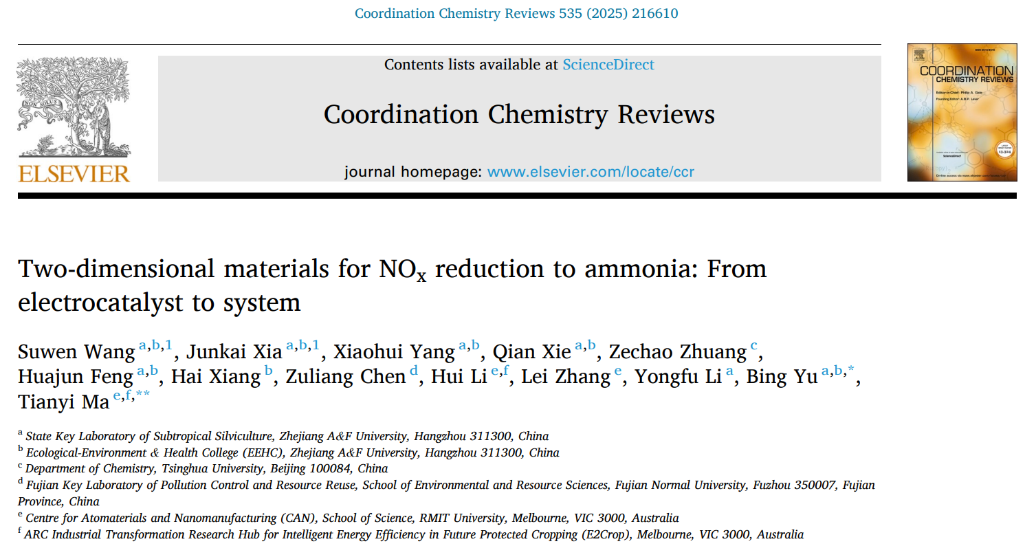 3月20日,環資院、碳中和學院余兵教授領銜的環境功能材料團隊在國際頂尖綜述《Coordination Chemistry Reviews》(中科院1區Top,IF=20.3)在線發表題為“Two-dimensional materials for NOxreduction to ammonia: From electrocatalyst to system”(二維材料用于氮氧化物還原制氨:從電催化劑到反應體系)的綜述論文。浙江農林大學為該論文第一單位和通訊作者單位。該團隊2021級碩士研究生汪素聞、夏浚凱分別為第一作者和共同一作,環資院、碳中和學院余兵教授為該論文的通訊作者。