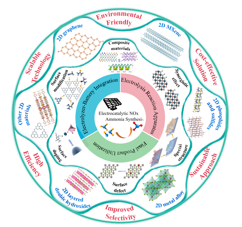該論文首先系統性概述了電化學還原氮氧化物的基本原理,重點解析了NO3?RR、NO2?RR和NORR的起始吸附行為與反應決速步,并探討了電解液濃度、pH值及反應電位等關鍵環境參數對反應路徑的調控機制。其次,論文聚焦二維材料體系(石墨烯、MXene、金屬硫化物等),深入探討了電子結構調控、界面工程及缺陷構筑等策略對NOxRR多活性位點的協同增強效應。最后,論文總結了NOxRR工業化發展的三大關鍵方向:電極反應裝置優化提升反應產率與穩定性;建立Zn-NO3?電池集成應用;建立氨捕獲系統實現電解液中NH3的原位分離與氨肥定向制備。