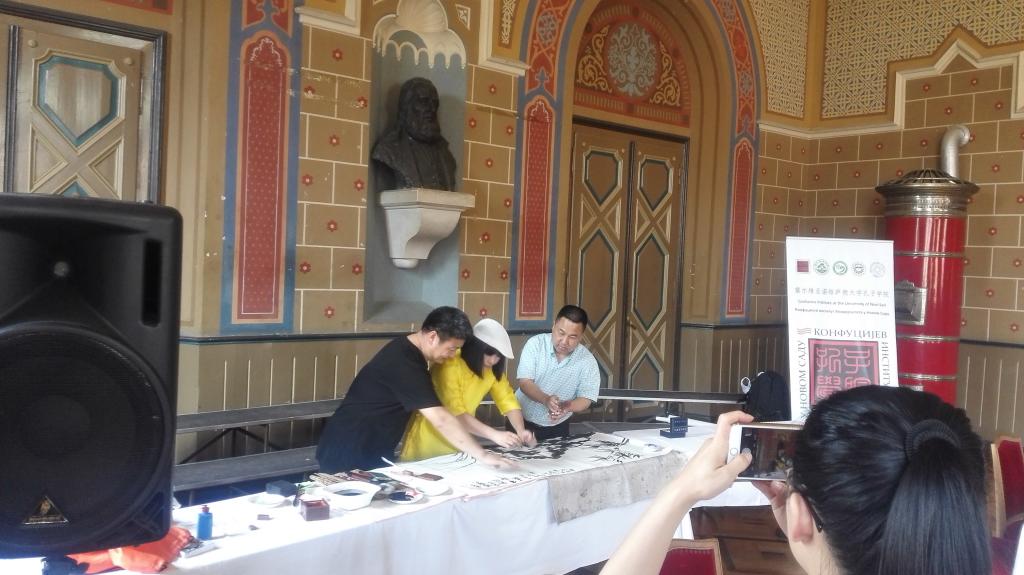 中國知名書畫家吳建明、夏偉革和王赟現場揮墨,共同完成一幅“三友圖——石生竹蘭”水墨畫作,并作為禮物贈送孔子課堂,以此寄望中塞友誼長存。